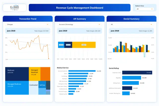 Use our intelligent analytics to obtain tangible metrics for each step of your workflow. The GeBBS interactive dashboard provides healthcare data analytics reports with powerful visualizations in real-time, which you can use to trigger organization-wide process evolution.